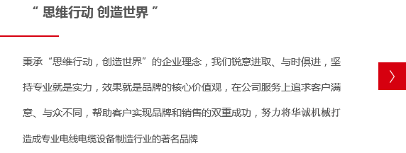 华城企业在追求“没有最好,只有更好”的目标下,不断引进和吸收国内外同行业的精华。以现代的设备和技术优势,完善的企业生产管理体系,制造出款式新颖、操作简便,经济实用的高品质电线电缆专用设备。